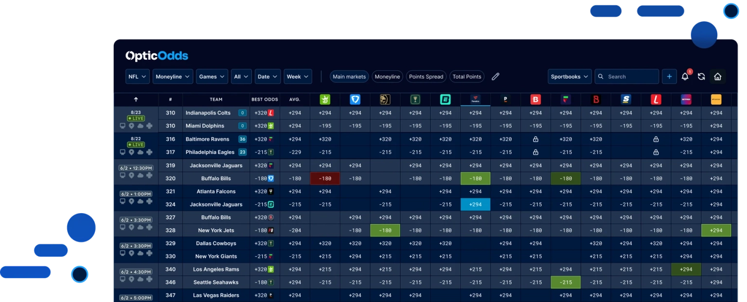 The OpticOdds Odds Screen ensures that you are never off from the market upon opening. OpticOdds offers real-time odds and lines from over 200 sportsbooks, including player props & alternate markets.